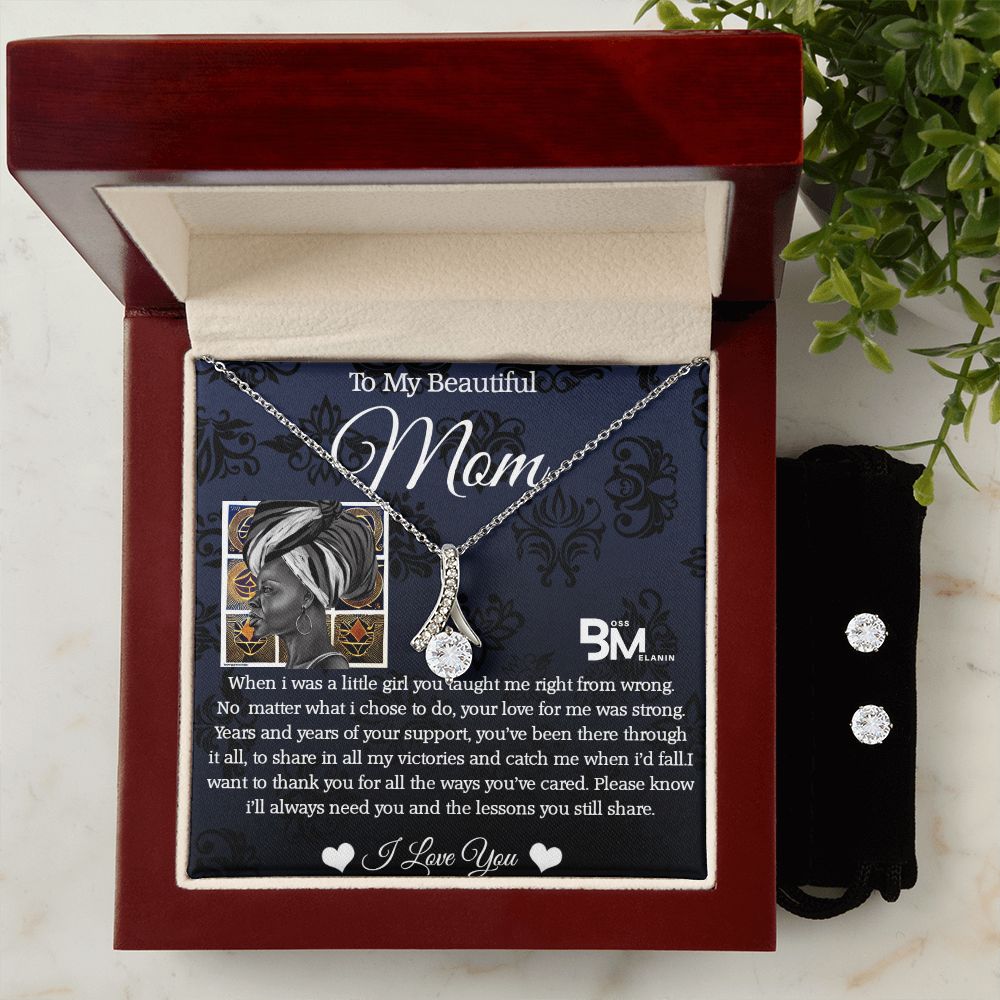 Matching Earrings and pendant chain - Perfect Black woman gift encrusted with Zirconia - Zirconia for Beautiful, strong Black mom, Melanin Black mom, with unique Gift card message.